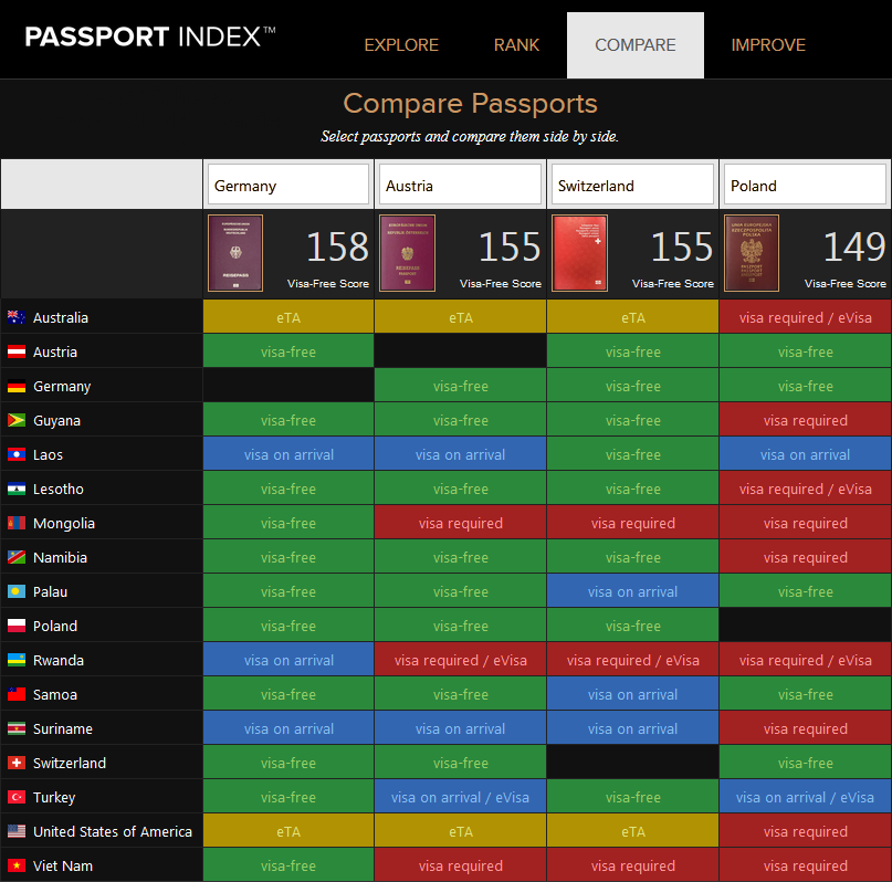 W porównaniu niemieckiego i polskiego dokumentu, główną różnicą pozostaje chyba wolny wjazd dla niemieckich i "wizowy" dla polskich obywateli do Stanów Zjednoczonych i Australii. W poniższej grafice porównaliśmy, na już wyżej wymienionej stronie, paszporty: niemiecki, austriacki, szwajcarski i polski. Tutaj uwzględniliśmy tylko główne różnice: