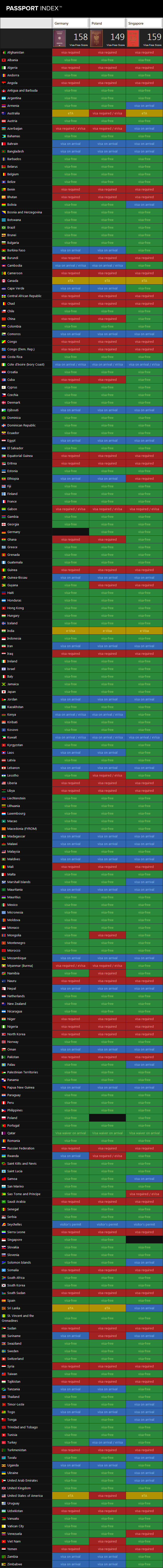 Przez ostatnie dwa lata na niemieckim paszporcie można było odwiedzać "bezwizowo" 158 krajów i był to rekord w skali wolnego poruszania się po świecie. Także i w tym roku ilość odwiedzanych krajów jest niezmienna i niemiecki paszport pozostaje nadal bardzo mocnym dokumentem, ale ze 159 krajami wysuwa się Singapur jednoznacznie na prowadzenie. W wyniku aktualnie wyhandlowanych zasad wizowych, singapurski dokument otwiera wrota do jednego kraju więcej.